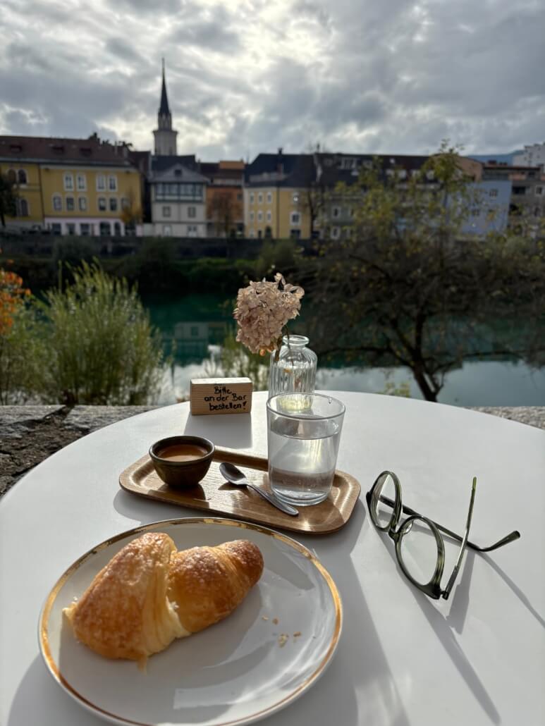 Der Stadt begegne ich im Oktober 2025 an der Draubrücke. Brücken und Flüsse sind immer gute Stadträume. Ein paar Tische, Sessel, Biest Café. Die Sonne kommt auch gerade heraus. Ich schaue hinüber auf die Stadt, die ich noch nicht kenne. Zu der ich nicht vor gelesen, zu der ich noch keine Bilder und Worte habe. Das Buch „Villach“ in der Reihe „Europa erlesen“ im Wieser Verlag habe ich zu spät vor meiner Abreise entdeckt und bestellt.