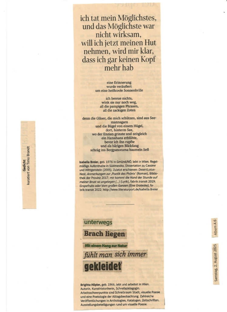 Meine Blicke, die natürlich nicht unvoreingenommen sind, suchen den Text einer Stadt, die sichtbaren und unsichtbaren Erzählungen, die Schichten des Palimpsests einer Stadt, die Teile der Stadtcollage. Ich suche die Zwischenräume, die toten Winkel, die versteckte Poesie. Ich entkomme meiner Perspektive nicht.